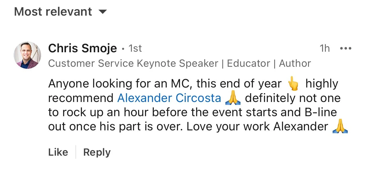 “You have an energy & charisma about you that just makes you born to host events & entertain crowds”
